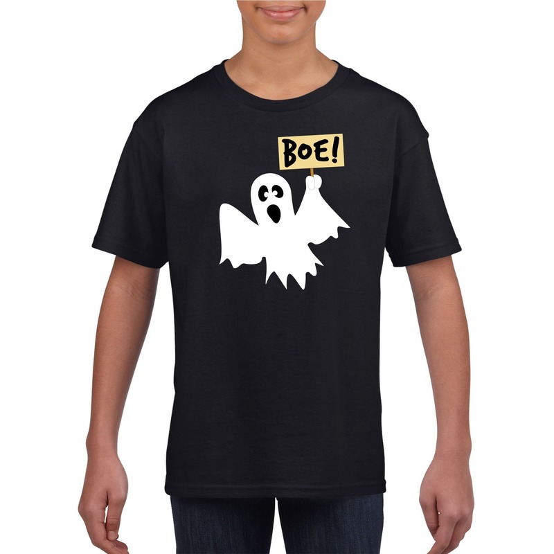 Halloween spook verkleed t-shirt in het zwart voor jongens en meisjes. Op dit zwarte shirt staat een spookje met een bordje met de tekst Boe gedrukt. Materiaal: 150 grams, 100% katoen.