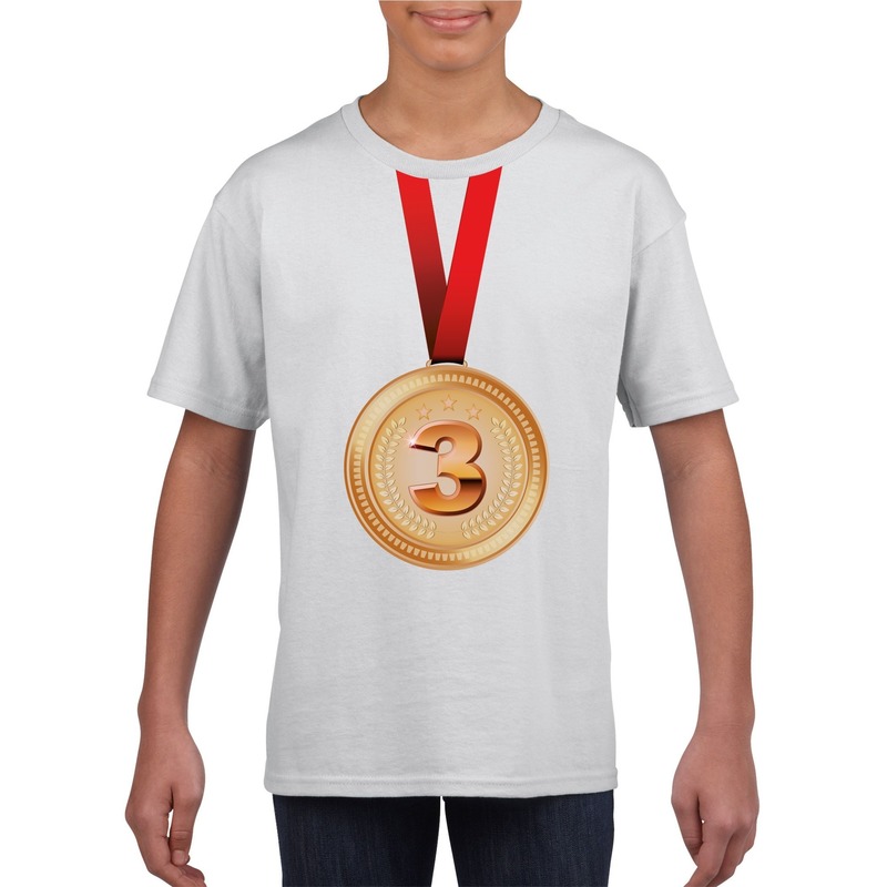 Bronzen medaille shirt wit jongen & meisjes voor de winnaar nummer 3. Op dit witte shirt staat een grote bronzen medaille aan rood lint gedrukt. Leuk als prijs voor de nummer 3 op een sportdag, kinderfeestje of ander evenement. Materiaal: 150 grams, 100% katoen.