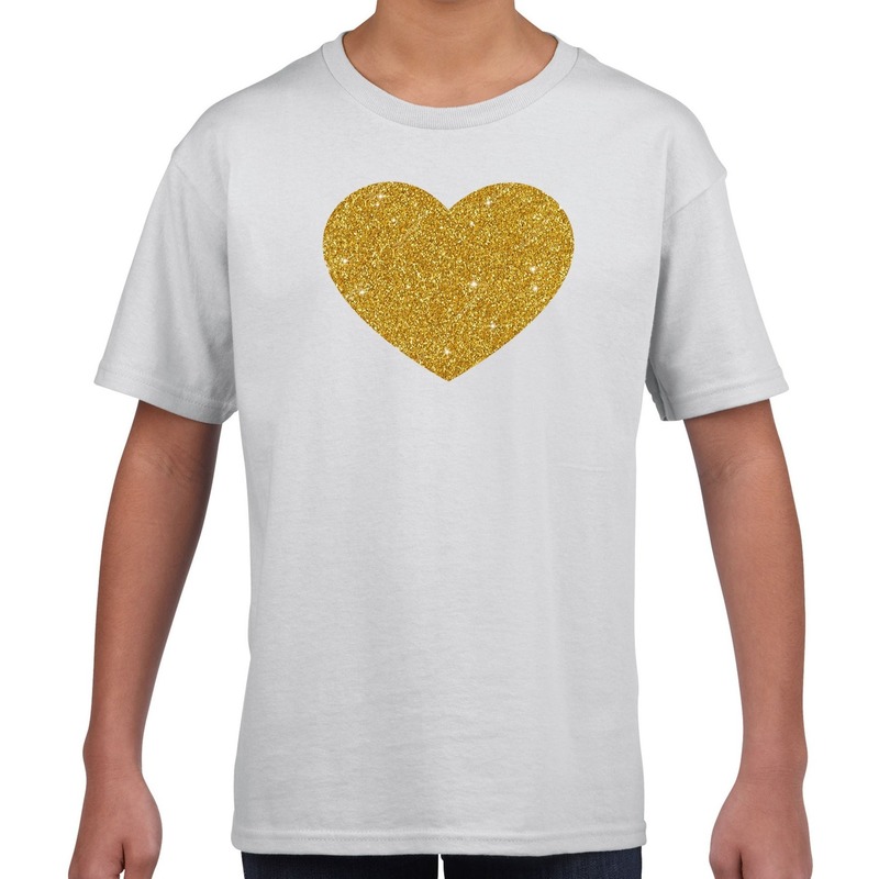 Feestkleding t-shirt voor kinderen, met gouden glitter hartje vorm, in het wit, met korte mouwen. Op dit t-shirt staat groot de afbeelding van een gouden hartje vorm met glitters folie. Materiaal: 150 grams, 100% katoen. Verkleedkleding voor jongens en meisjes.