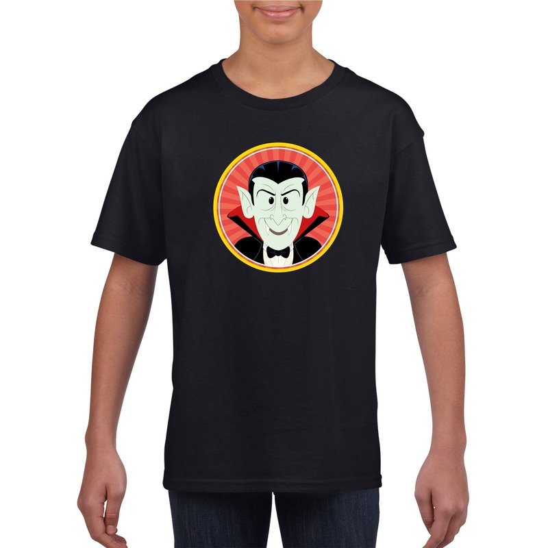 Halloween vampier/Dracula t-shirt zwart voor jongens en meisjes. Op dit zwarte shirt staat een afbeelding van een vampier/graaf Dracula gedrukt. Materiaal: 150 grams, 100% katoen.
