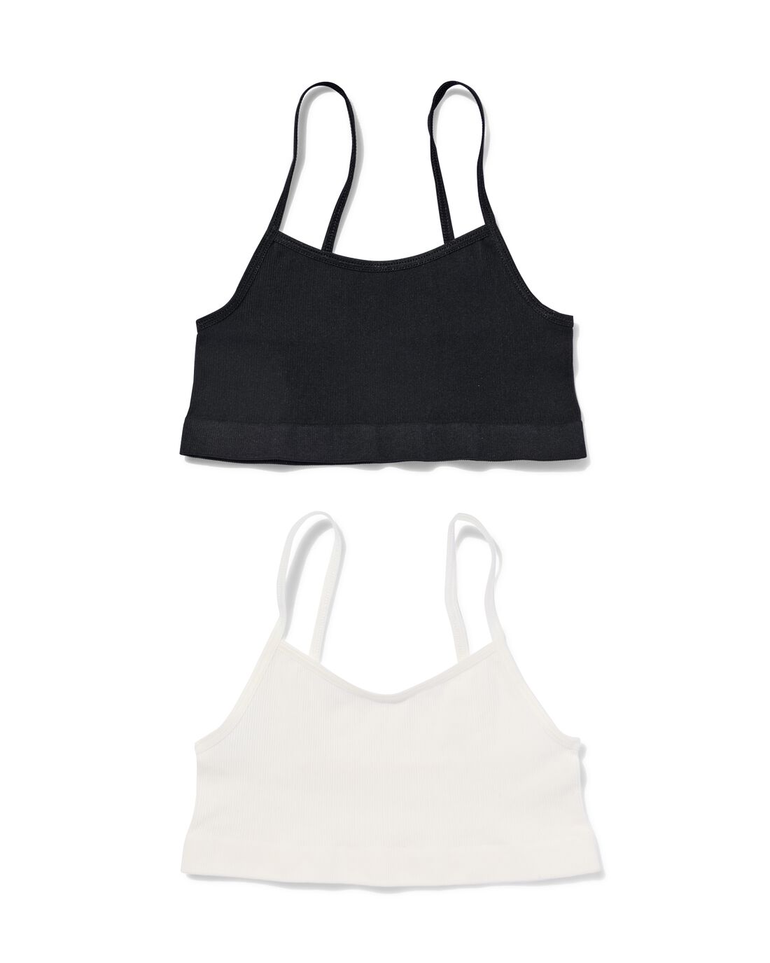 Een set van twee kinder tops met smalle schouderbandjes in de kleuren zwart en wit. De tops zijn zacht en erg elastisch door de ribstructuur. Naadloos ondergoed sluit goed aan op het lichaam, schuurt niet en is onzichtbaar onder kleding.
