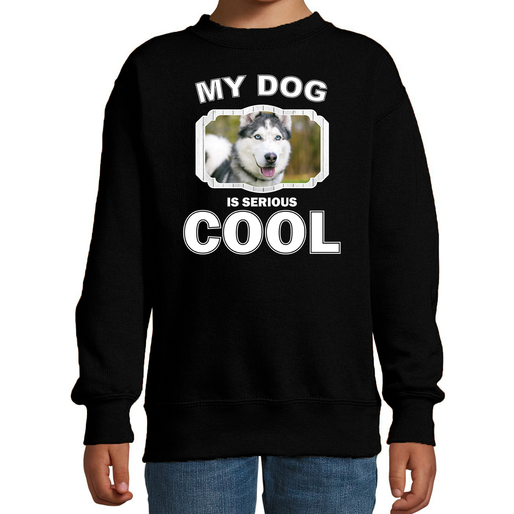 Husky honden trui / sweater my dog is serious cool zwart voor kinderen. Deze zwarte sweater is voor iedereen die een Husky hond heeft of fan is van Siberische huskys. De trui is bedrukt met een hond en de tekst: my dog is serious cool. Ook leuk om cadeau te doen aan iedere honden liefhebber, bijvoorbeeld uw zoon of dochter.