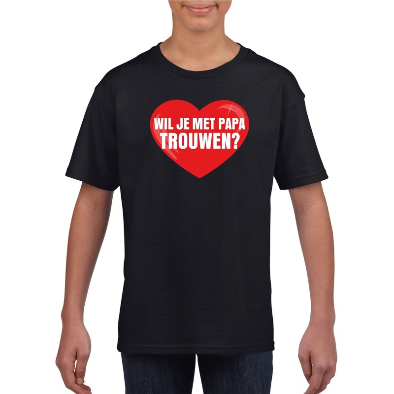 Huwelijksaanzoek t-shirt Wil je met papa trouwen zwart voor kinderen. Betrek met dit t-shirt uw kind bij uw huwelijksaanzoek en het antwoord is gegarandeerd ja! Op dit zwarte shirt staat een groot rood hart met de tekst: Wil je met papa trouwen?. Materiaal: 150 grams, 100% katoen.