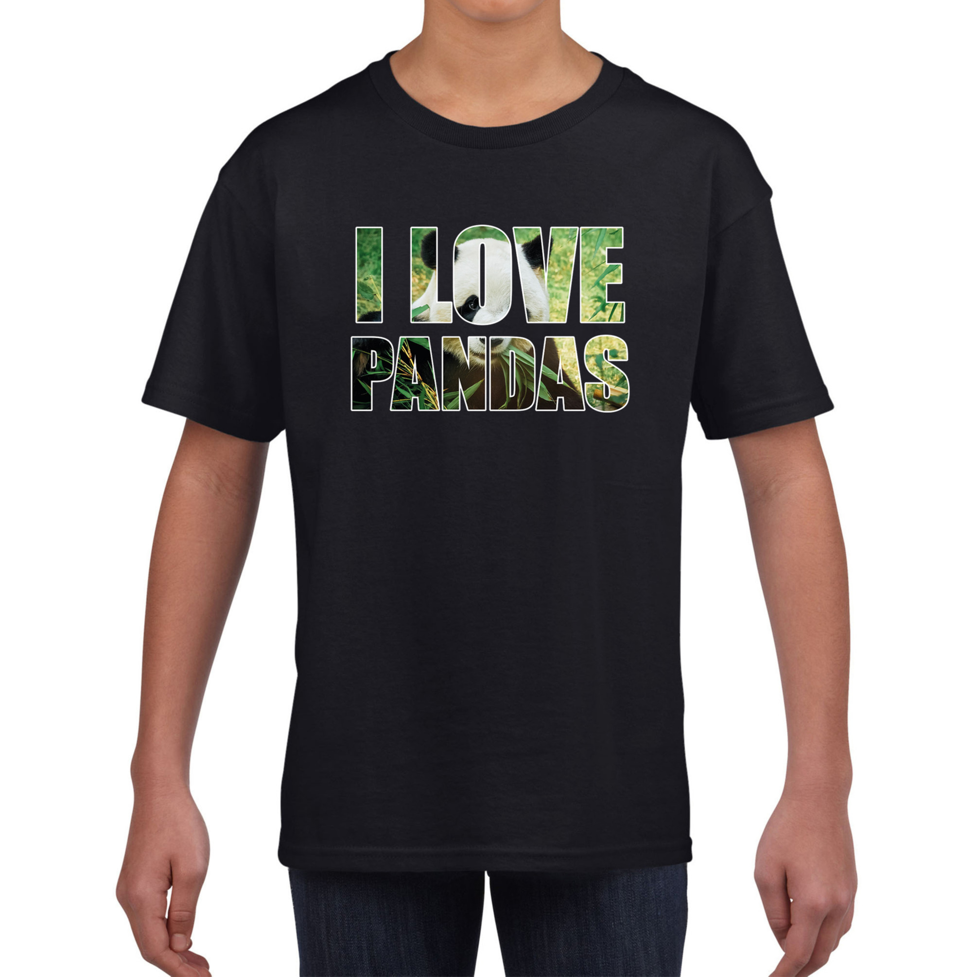 I love pandas dieren t-shirt zwart voor kids. Op dit shirt staat groot de tekst: I LOVE PANDAS. In de tekst is een afbeelding van Panda beertjes verwerkt. Een musthave voor Panda beren liefhebbers.