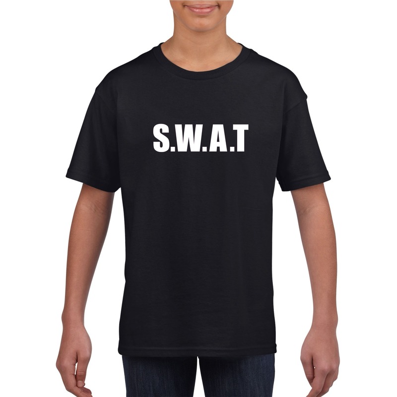 Politie SWAT Team tekst verkleedkleding t-shirt, in het zwart, voor jongens en meisjes. Op dit zwarte shirt staat groot de tekst SWAT. Materiaal: 150 grams, 100% katoen. Politie verkleedkleding voor carnaval.