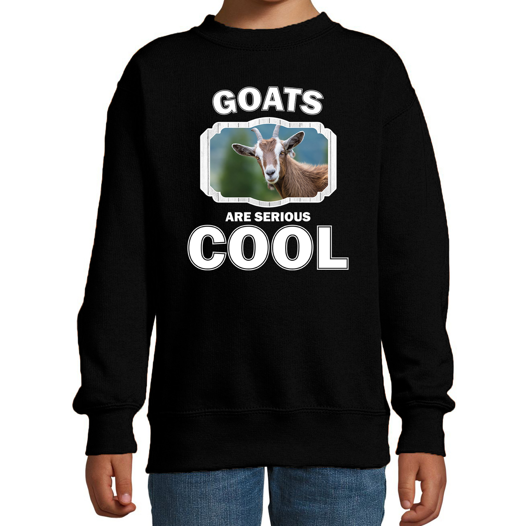 Dieren sweater geit zwart voor kinderen. Op deze jongens/ meisjes trui staat een geiten afbeelding en de tekst: goats are serious cool. Een musthave voor een echte dieren/ geiten liefhebber of iemand die alles van geiten spaart. Erg leuk om cadeau te doen aan een echte geiten fan of gewoon om zelf te dragen!