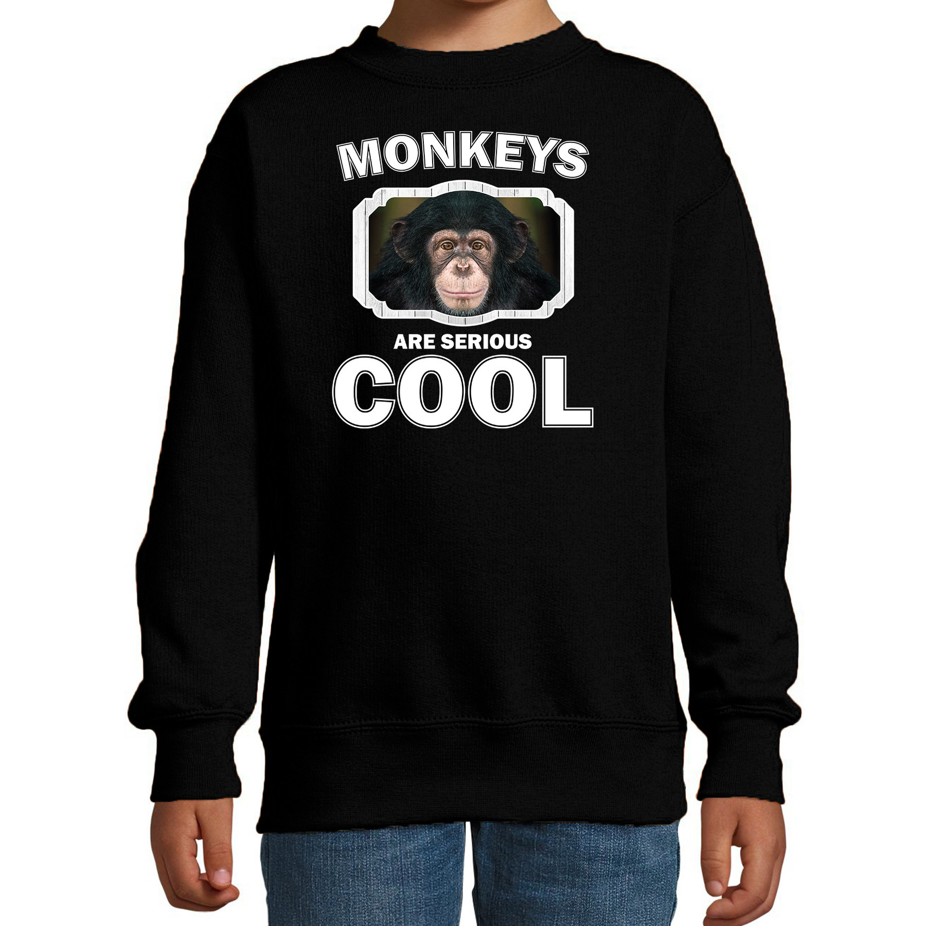 Dieren sweater leuke chimpansee zwart voor kinderen. Op deze jongens/ meisjes trui staat een apen afbeelding en de tekst: monkeys are serious cool. Een musthave voor een echte dieren/ apen liefhebber of iemand die alles van apen spaart. Erg leuk om cadeau te doen aan een echte apen fan of gewoon om zelf te dragen!