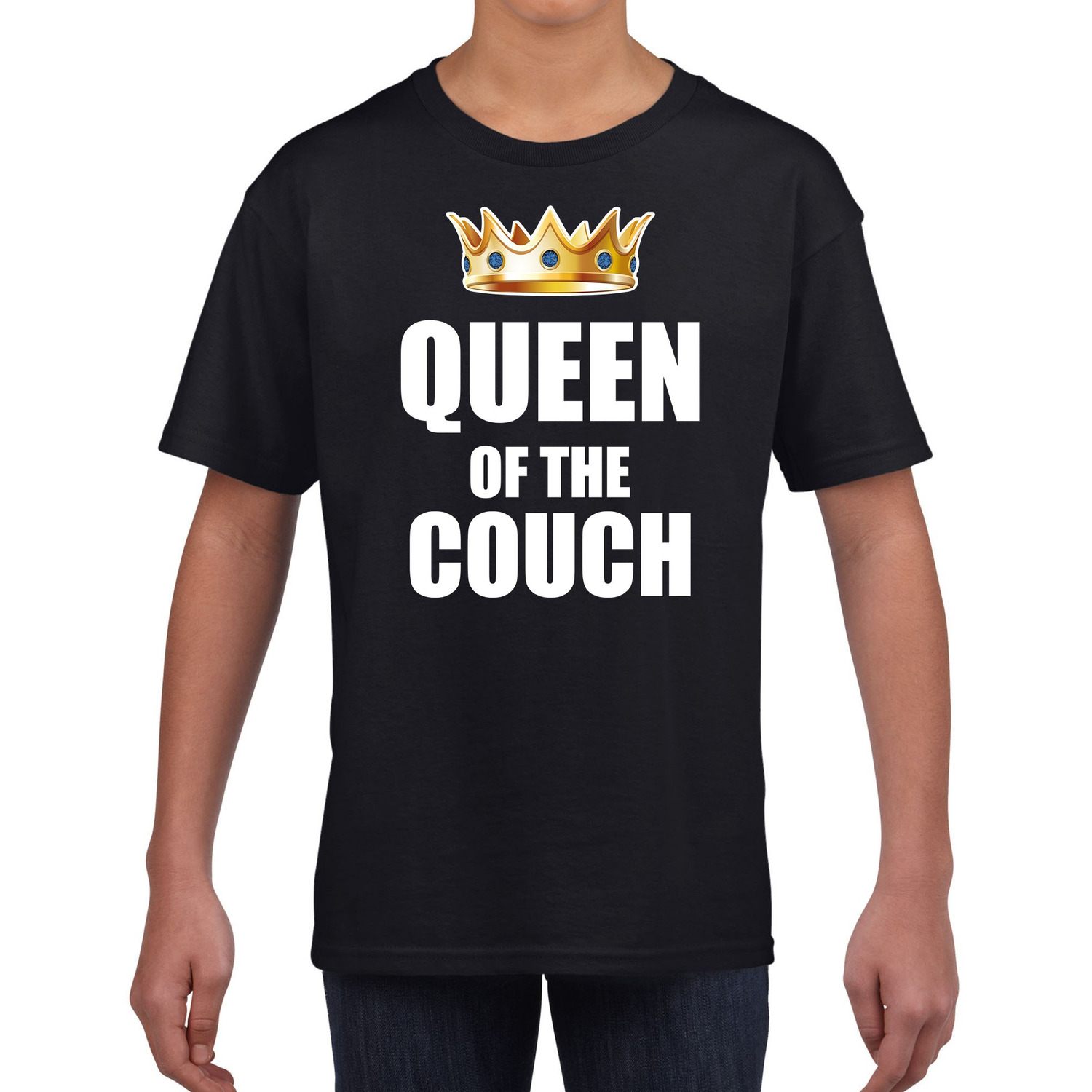 Koningsdag t-shirt queen of the couch zwart voor meisjes / kinderen. Blijft u lekker thuis en is het bankstel voor u gereserveerd? Dan is dit zwarte shirt, met de tekst: Queen of the couch, de perfecte outfit.