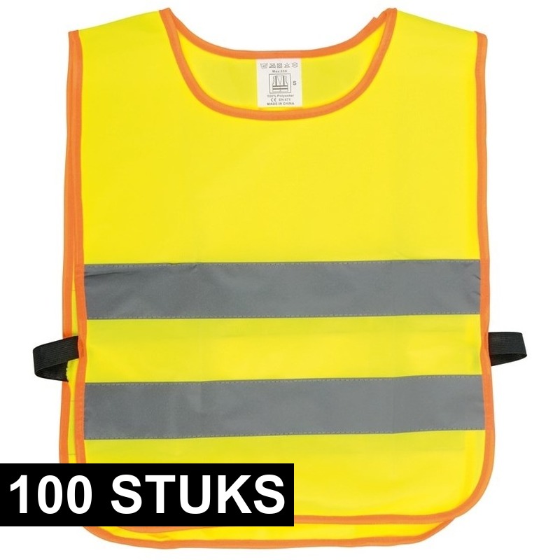 100x dit fluorescerend gele veiligheidsvest heeft reflecterende strepen. Het vest is geschikt voor kinderen. Maat: one size, formaat 47 x 37 cm. Materiaal: polyester. Wasvoorschrift: Enkel handwas.