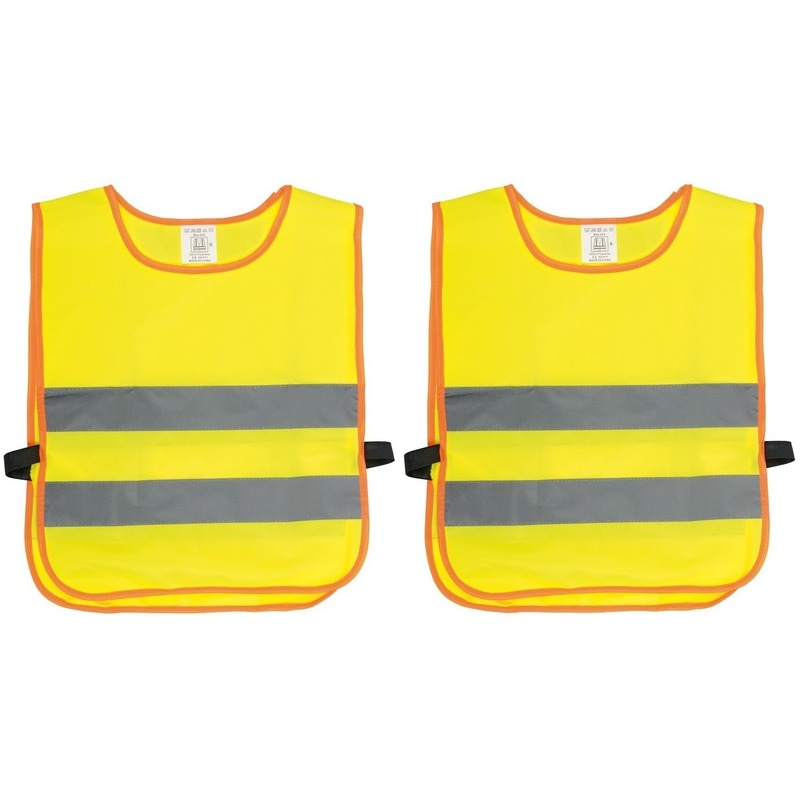 2x dit fluorescerend gele veiligheidsvest heeft reflecterende strepen. Het vest is geschikt voor kinderen. Maat: one size, formaat 47 x 37 cm. Materiaal: polyester. Wasvoorschrift: Enkel handwas.