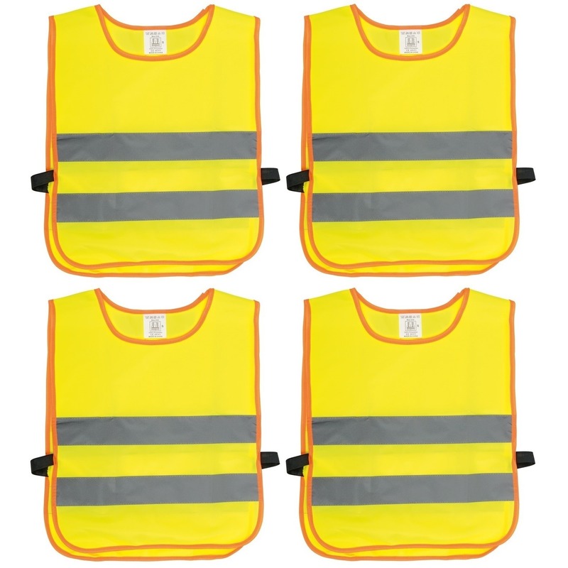 4x dit fluorescerend gele veiligheidsvest heeft reflecterende strepen. Het vest is geschikt voor kinderen. Maat: one size, formaat 47 x 37 cm. Materiaal: polyester. Wasvoorschrift: Enkel handwas.