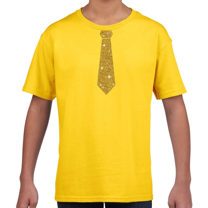 Verkleedkleding t-shirt in het geel met kleine stropdas gevuld met gouden glitters, voor kinderen. Op dit t-shirt staat de afbeelding van een goudkleurige stropdas. Leuk voor een thema/feestje. Materiaal: 150 grams, 100% katoen. Carnaval verkleedkleding shirts voor een glitter and glamour thema shirt.