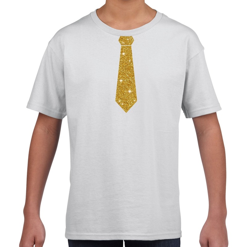 Verkleedkleding t-shirt in het wit met kleine stropdas gevuld met gouden glitters, voor kinderen. Op dit t-shirt staat de afbeelding van een goudkleurige stropdas. Leuk voor een thema/feestje. Materiaal: 150 grams, 100% katoen. Carnaval verkleedkleding shirts voor een glitter and glamour thema shirt.