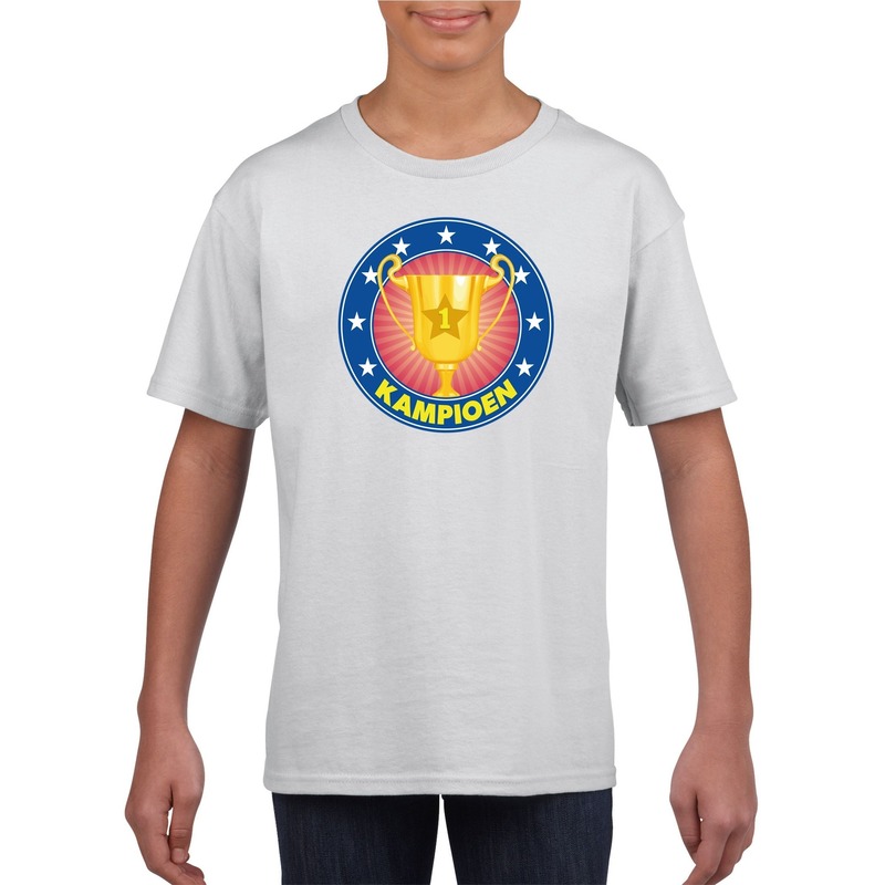 Wit kampioen t-shirt voor jongens en meisjes. Op dit shirt staat een grote kampioen beker met de tekst: kampioen. Materiaal: 150 grams, 100% katoen.
