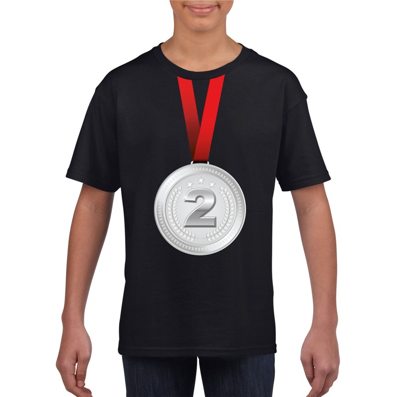 Zilveren medaille shirt zwart heren voor de winnaar nummer 2. Op dit zwarte shirt staat een grote zilveren medaille aan rood lint gedrukt. Leuk als prijs voor de nummer 2 op een sportdag, bedrijfsuitje of ander evenement. Materiaal: 150 grams, 100% katoen.